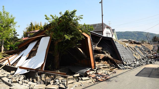 MASHIKI, JAPAN – APRIL 15: A house is seen collapsed a day after the 2016 Kumamoto Earthquake on April 15, 2016 in Mashiki, Kumamoto, Japan. As of April 15 morning, at least nine people died in the powerful earthquake with a preliminary magnitude of 6.4 that struck Kumamoto Prefecture on April 14, 2016. (Photo by Masterpress/Getty Images)