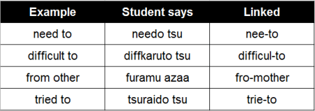 For example, students are likely to pronounce words that end in a hard consonant like ‘k’ or ‘d’ as ‘ku’ or ‘do’ because that is how they pronounce things in katakana English. Consonant-final words can be linked to words beginning with the same/similar consonant or vowel-initial words easily. Linking these words often reduces the effect of katakana English while also improving your student’s speaking fluency.
